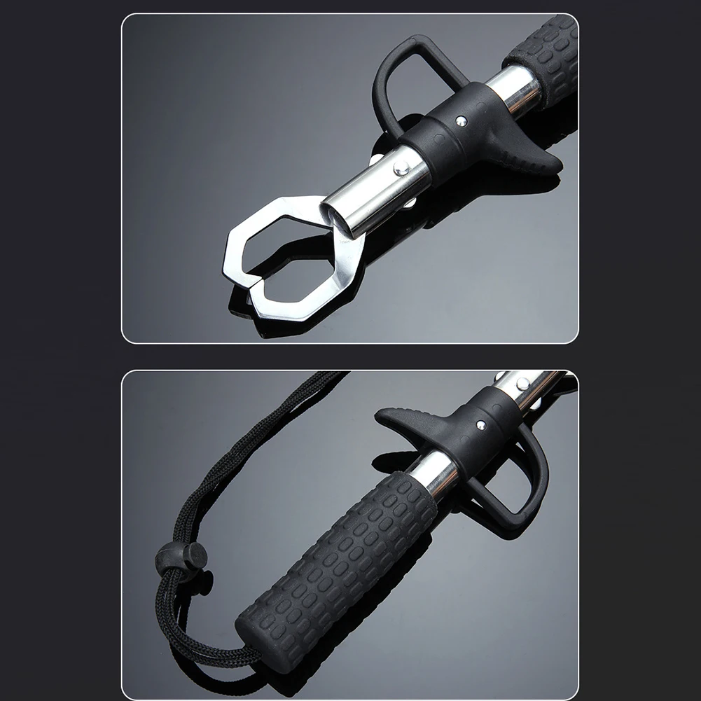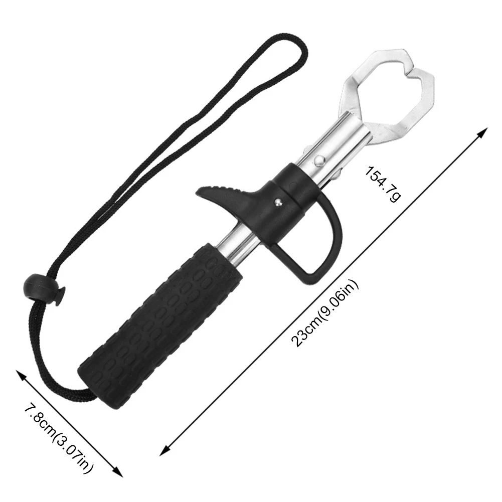 23CM Stainless Steel Fishing Gripper Anti-Slip Handle Fish Controller Professional Fish Grip Lip Clamp Grabber Portable Fish Grip Lip Catcher Pliers Fishing Accessories Feature: 1. Stainless Steel Construction: The fishing gripper is crafted from high-quality stainless steel, ensuring corrosion resistance and enhanced durability. This makes it an ideal tool for both freshwater and saltwater fishing, offering longevity and reliability for all your fishing adventures. 2. Secure Fish Handling: With the fish controller, experience a tight grip on your catch. The precise engineering of the grip allows for easy control over the fish, minimizing harm to both the angler and the catch, making it a humane and efficient tool for catch-and-release practices. 3. Convenient Pull Ring Design: The professional fish grip lip clamp grabber features a comfortable pull ring, enabling effortless operation. This design ensures that you can securely hold and release your catch with one hand, making it a convenient tool for fishermen of all skill levels. 4. Non-Slip Handle for a Firm Grip: Equipped with a non-slip handle, the portable fish grip lip catcher pliers provide a stable and firm grasp even in wet conditions. This thoughtful feature ensures maximum control and safety, preventing accidental slips that could result in loss of catch or injury. 5. Compact and Portable: The fish lip grabber is designed for portability, easily fitting into your tackle box or fishing vest. Its lightweight and compact design make it an essential tool for anglers on the go, ensuring you're always prepared for the perfect catch, wherever your fishing adventures may take you. Specification: Product name: Fish controller Product material: Aluminum alloy Product color: black Product size: 23cm(9.06in)x7.8cm(3.07in) 1 x Fishing Gripper