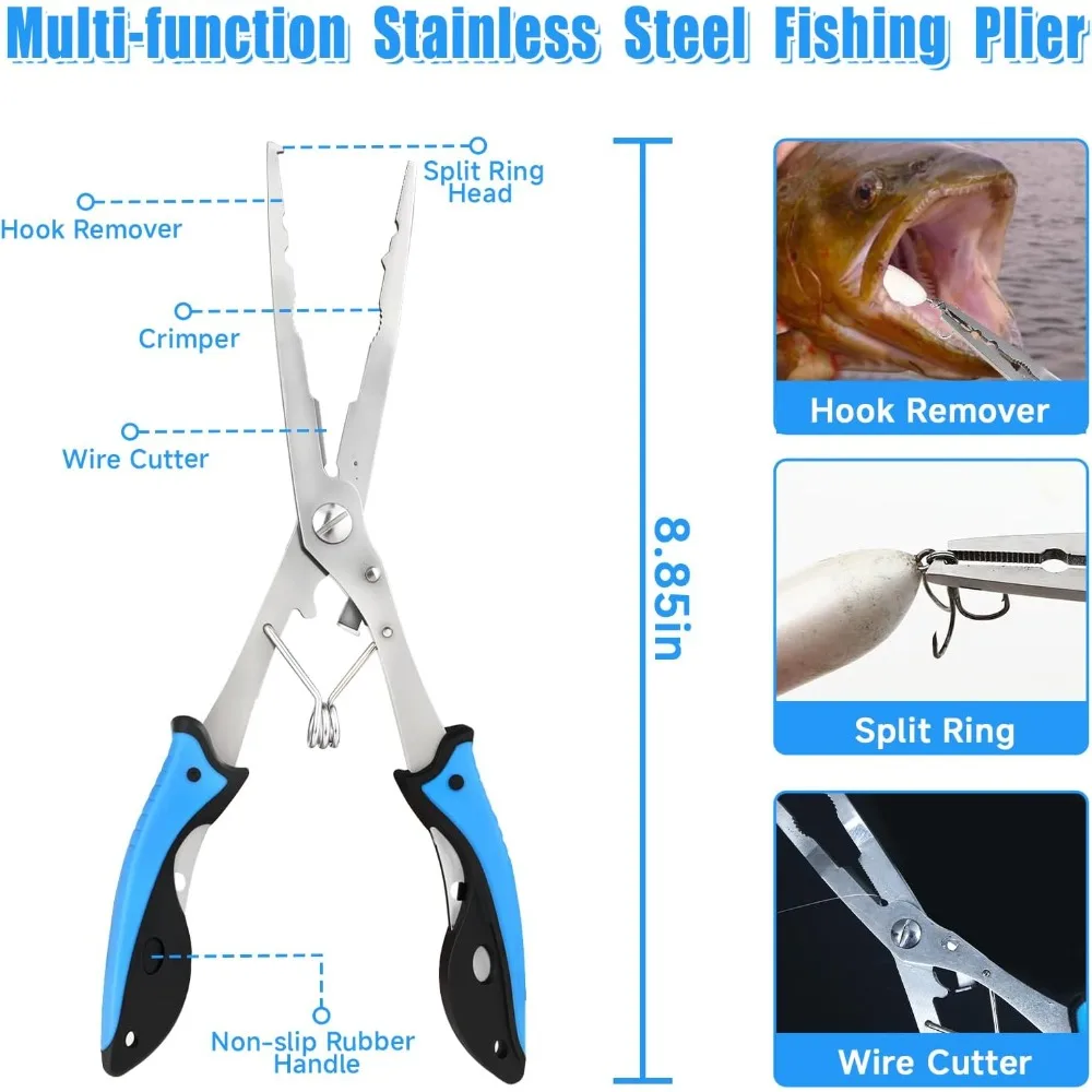 - VERSATILE FISH PLIERS: Multi-purpose pliers feature Split Ring Head, Hook Remover, Wire Strippers, Crimper, Wire Cutter for ordinary nylon fishing wire, carbon wire or iron wire. Three crimping slots are designed for different types of leads. Quickly remove hook or replace treble hook on your lure while catching fish or utilize the carbide cutters to cut fishing line or other fishing tasks. Non-slip grip handle avoids pliers slipping. Fish plier overall length: 8.85 inches.