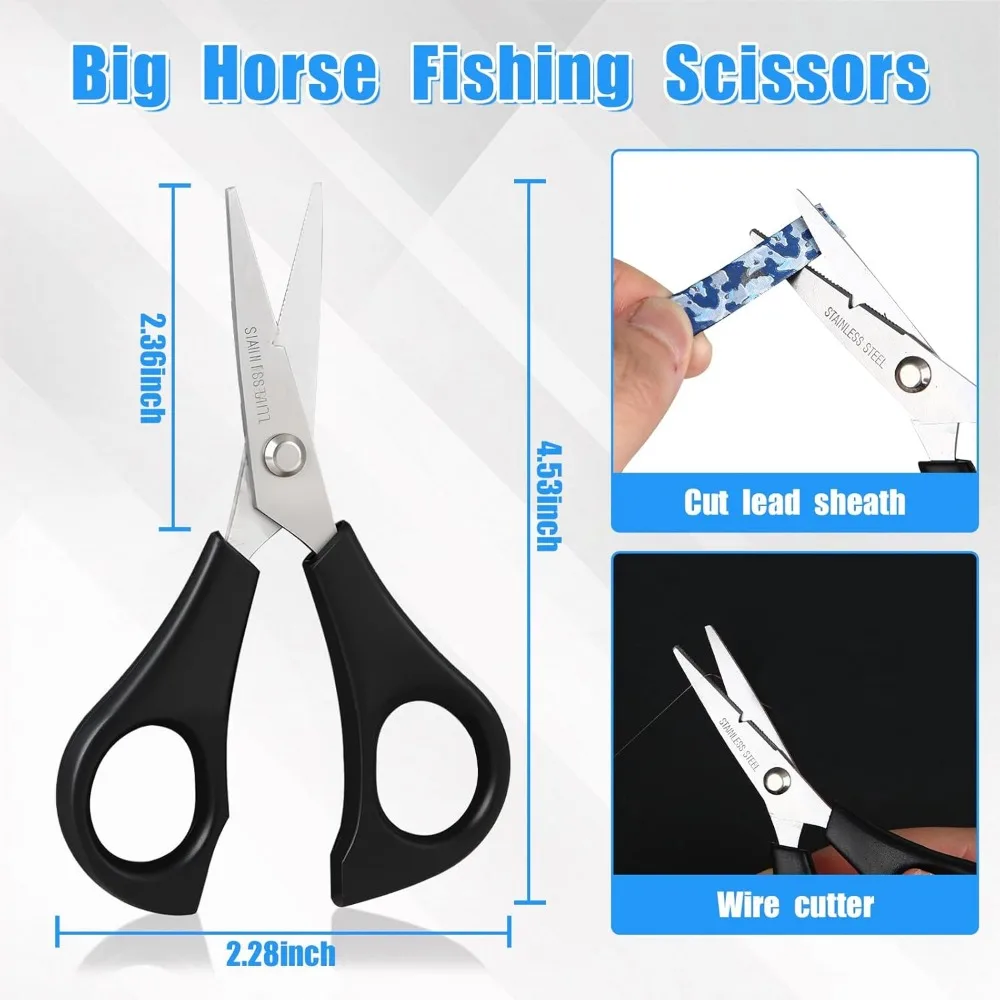 - VERSATILE FISHING LINE SCISSOR: Sharp fish scissors or clippers fetures precision ground micro-serrated blade, easily cuts through lead sheet and various types of fishing line: monofilament, and fluorocarbon fishing lines, braid or PE fishing line from 5 to 100lbs. This fish line cutter is made of stainless steel anti-seawater corrosion material, ergonomic handle and easy to handle.