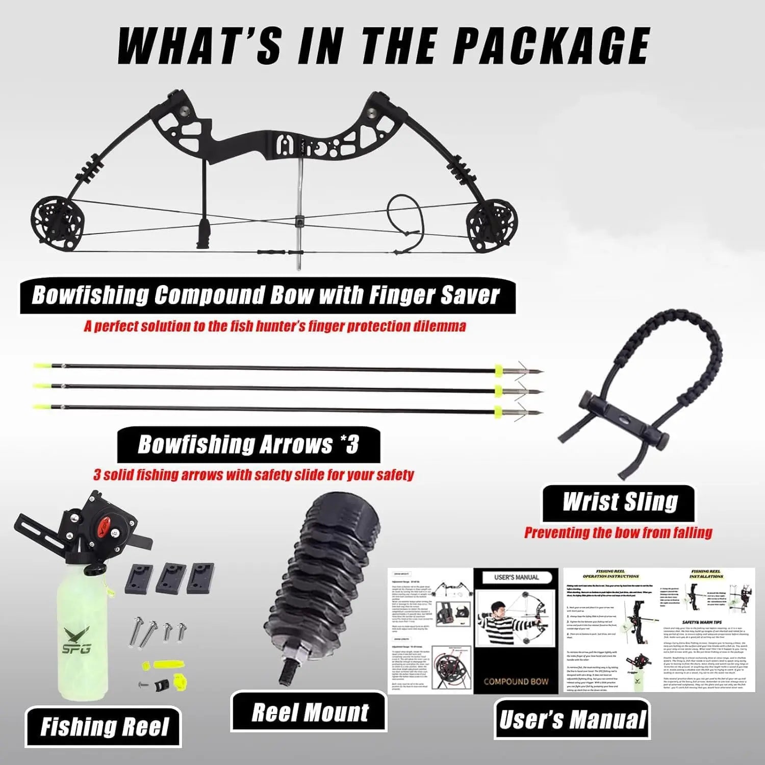 5. PACKAGE INCLUDES: 1 Bowfishing Compound Bow (with Finger Saver) + 1 Bottle Fishing Reel + 3 Fishing Arrows + 3 Fishing Arrows Safety Slide Kits+ 1 Stabilizer + 1 Wrist Sling +User's Manual. Get ready for an unforgettable fishing adventure and take your bow fishing game to the next level with our premium Compound Bow Fishing Kit!