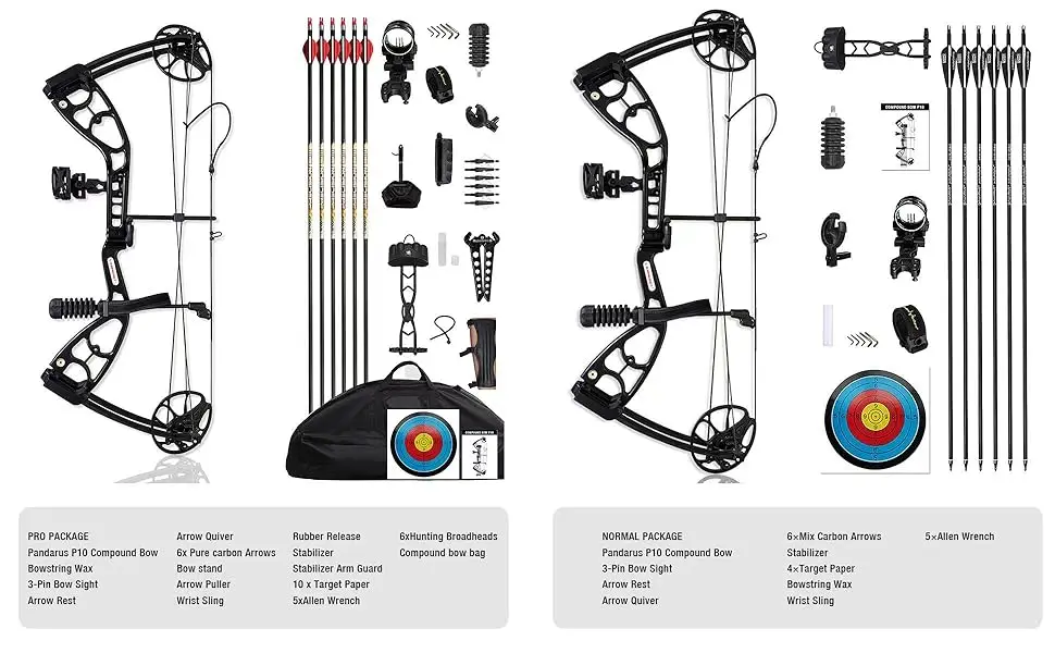 3. Pro Package:1*P10 Compound Bow,1*Bowstring Wax,1*3-Pin Bow Sight ,1*Arrow Rest ,1*Arrow Quiver ,6 * Pure carbon Arrows,1*Bow stand,1*Arrow Puller,1*Wrist Sling,1*Rubber Release,1*Stabilizer,1*Arm Guard ,10 * Target Paper,5*Allen Wrench,6*Hunting Broadheads,1*Compound bow bag