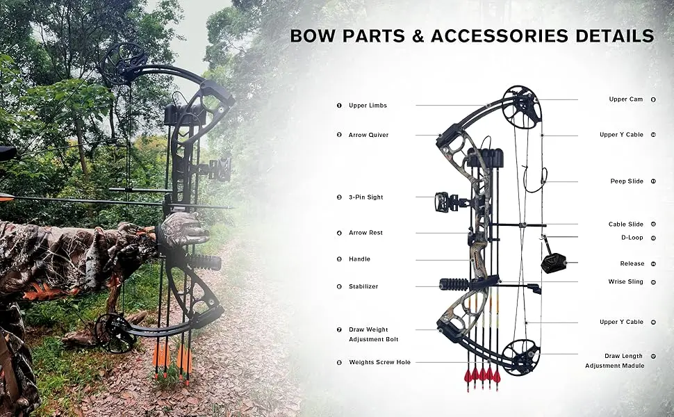 1. Specifications: Axle-to-Axle 32", Brace Height 7.6", Draw Weight 30-70 LBS Adjustable, Draw Length 25.4"-32" without needing a bow press, IBO Speed Up to 320FPS, Net Weight only 3.35 LBS,Let off 75%,String length:59.44",Cable length:33.27"*2,Color:Black/Camo
