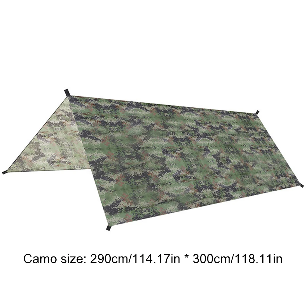 Camouflage Awning Sun Shelter 210T Polyester Yarn Camping Tent Tarp Waterproof Foldable Ultra-light Picnic Backpacking Equipment Feature: 1. Versatile Functionality: This sunshade canopy is not only designed to provide shade but also has features such as waterproofing, moisture-proofing, and rain protection. It can also be used as a ground mat or beach mat. When combined with tent poles and wind ropes, it becomes a full-fledged camping tent. 2. Waterproof Material: Made entirely of waterproof fabric, this geometric beach tent is not only long-lasting but also more user-friendly. The material used in production ensures that the product serves you for an extended period. 3. Suitable for Various Outdoor Activities: Whether you're going camping, having a barbecue, or just having an outdoor gathering, this sunshade canopy is perfect for you. With its moisture and waterproof functions, it keeps you dry while enjoying outdoor activities. 4. Easy to Install and Disassemble: This Beach Camping Sun Shelter Canopy is designed to save time and effort. You can easily install it without any frustration. Also, when you are done, it is easy to disassemble for storage. 5. Wide Range of Applications: This rain shelter is perfect for different occasions. It can serve as a beach mat, picnic mat, tent, and even car awning among others. Its versatility means you get value for money. Specification: Product material: 210T waterproof polyester yarn (outer tent polyester, inner tent silver coated) Waterproof coefficient: 1500mm Product size: with accessories: About 300x300cm/118.11x118.11inch Without accessories: About 100x145cm/39.37x57.08inch 1 x Outdoor Canopy