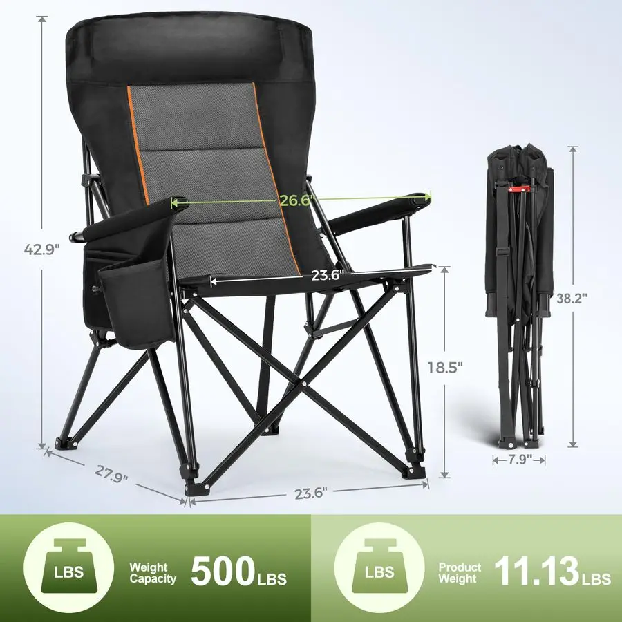 CAMP Oversized Camping Chairs 29.52 High Back Heavy Duty Lawn Chair Support 500LBS, Portable Collapsible Chair with Cup Holder,