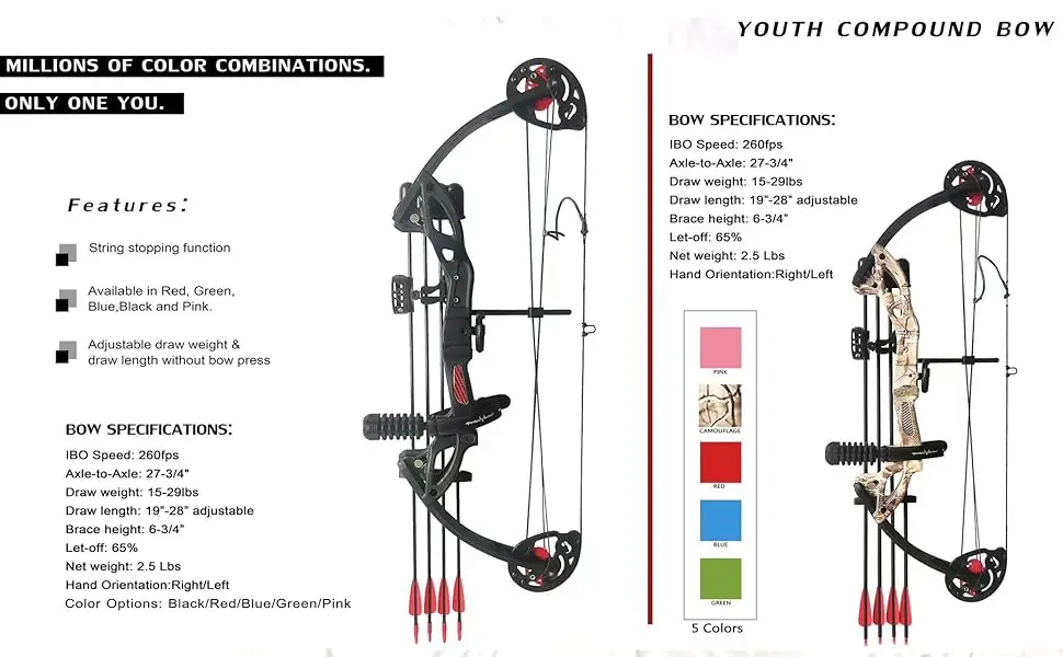 • 【ADVANCED CONSTRUCTION 】: Adjustable draw weight & draw length without bow press ; Available in Red, Green, Blue, Black and Pink ; String stopping function; The speed is higher than the same bow ; Light
