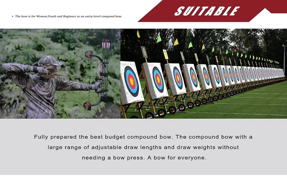 • 【WARM NOTICE】: Please read the manual carefully before you operate the bow. The bow is for Women,Youth and Beginner as an antry-level compond bow.DO NOT DRY FIRE (shoot the bow without arrow)! This will damage the bow and hurt yourself and the people around you.