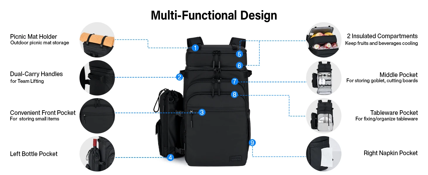 3. Multi-Compartment Design: This picnic backpack offers 2 insulated leak-proof cooling compartments for storing drinks or food. It has 2 zipper pockets for storing tableware at the front, and multiple built-in elastic bands to secure knives, forks and plates. An bottle opener can easily open the drink. There are also additional some pocket such as the small front pocket, wine bag and napkin pocket.Let you enjoy a convenient and long-lasting journey