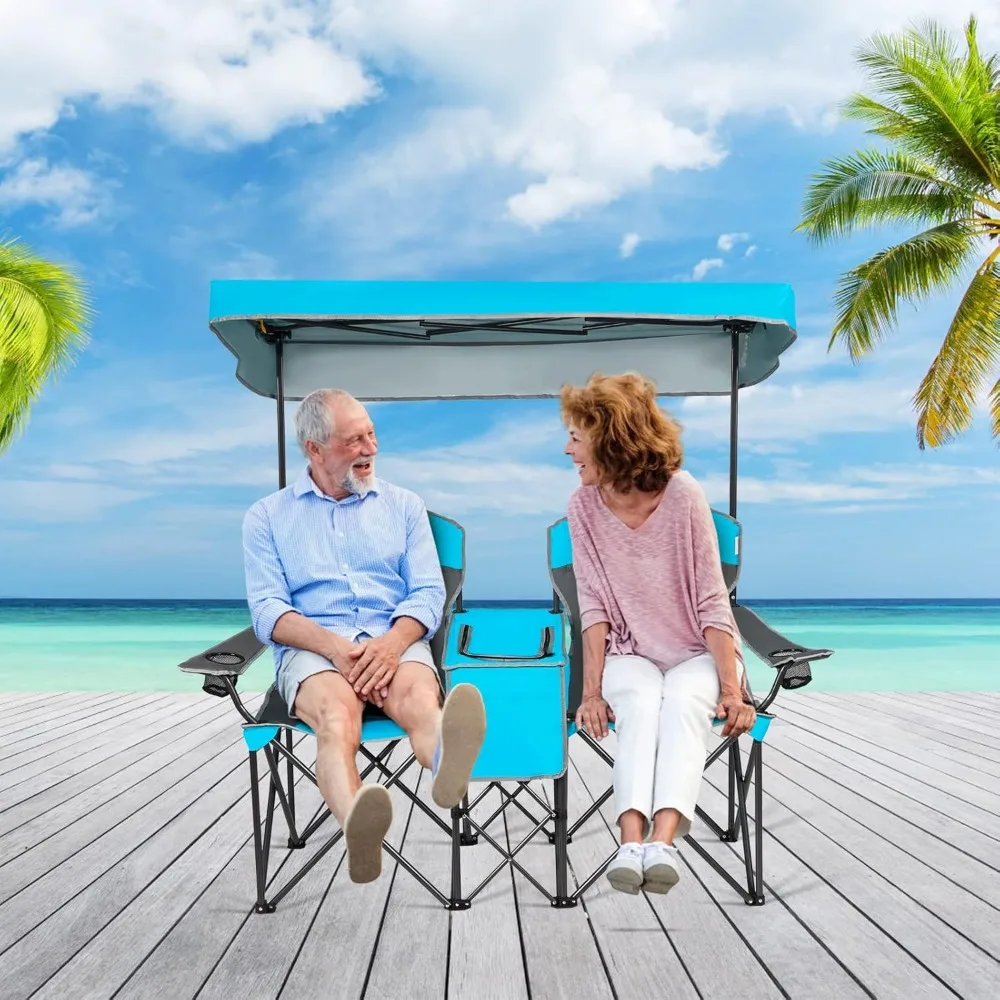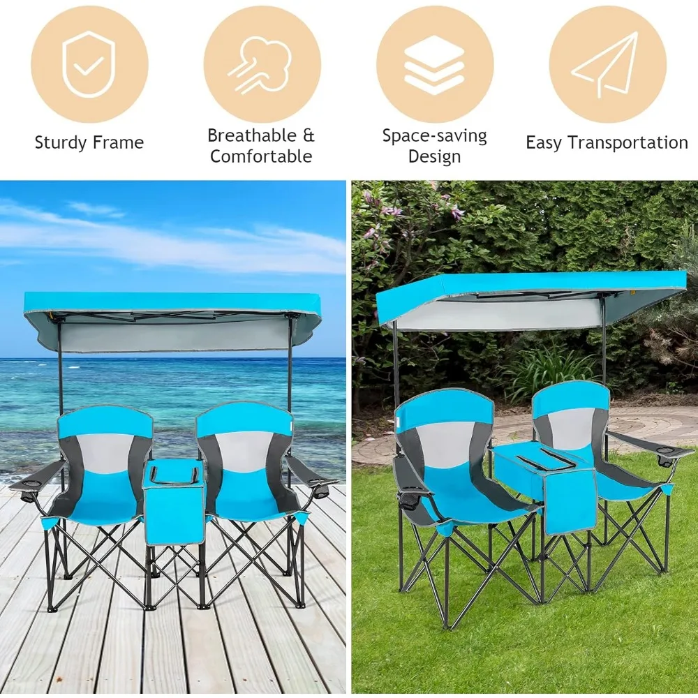 Double Camping Chair with Canopy, 2 Person Folding Beach Chair with Canopy Shade, Table Beverage Holder and Storage Bag, Double