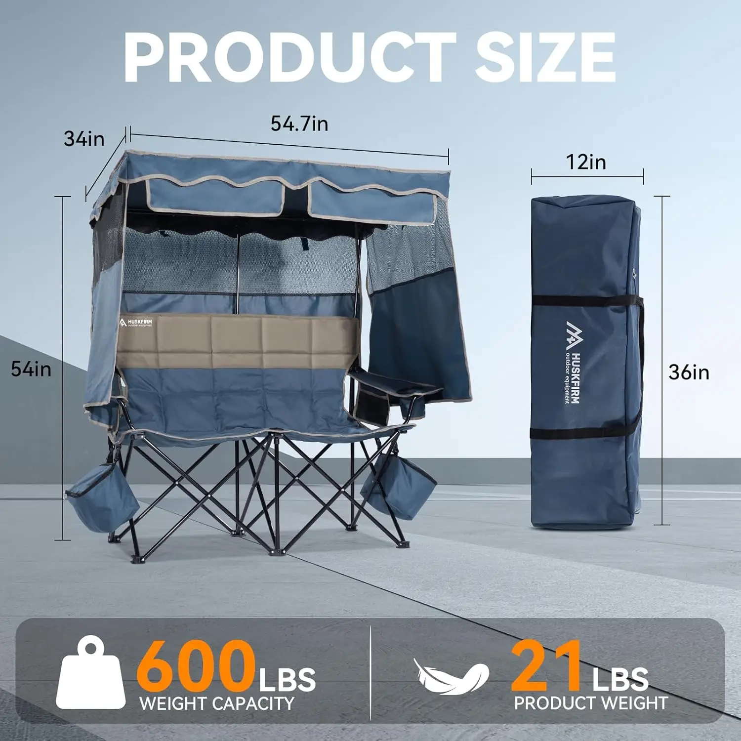 Experience ultimate comfort and convenience with our double camping chair designed for all your outdoor adventures. Key features include: 1. Adjustable Sun Protection: Equipped with a four-sided canopy featuring retractable side and front curtains, this chair offers flexible privacy and ventilation control. It effectively blocks sunlight from various angles, ensuring you stay cool and protected in diverse outdoor settings like beaches or campsites. 2. Versatile Canopy Design: The removable roof allows you to customize the chair based on your needs—use it with the canopy for shade or without for open-air enjoyment. Detailed video instructions make disassembly easy, adapting to different scenes effortlessly. 3. Practical Accessories: Each side of this two-person chair includes a cup holder, side pocket, and a spacious 9L cooler bag. The cup holder keeps drinks within reach, while the cooler bag lets you store cold beverages for summer outings, enhancing your comfort during long days outdoors. 4. Durable Construction: Built with high-quality materials such as 600D thickened Oxford fabric, polyester fiber seat pads, and ultra-durable steel frames, this chair ensures stability and safety. It supports up to 330 pounds per seat, providing reliable strength for extended use without compromising on comfort. 5. Portability and Storage: Lightweight at only 18 pounds, this folding loveseat chair can be quickly collapsed into its included storage bag for easy transport. Ideal for various occasions including camping, fishing, beach trips, picnics, and more—it offers a cozy resting spot wherever you go. This versatile double chair combines functionality with durability to elevate your outdoor experiences.