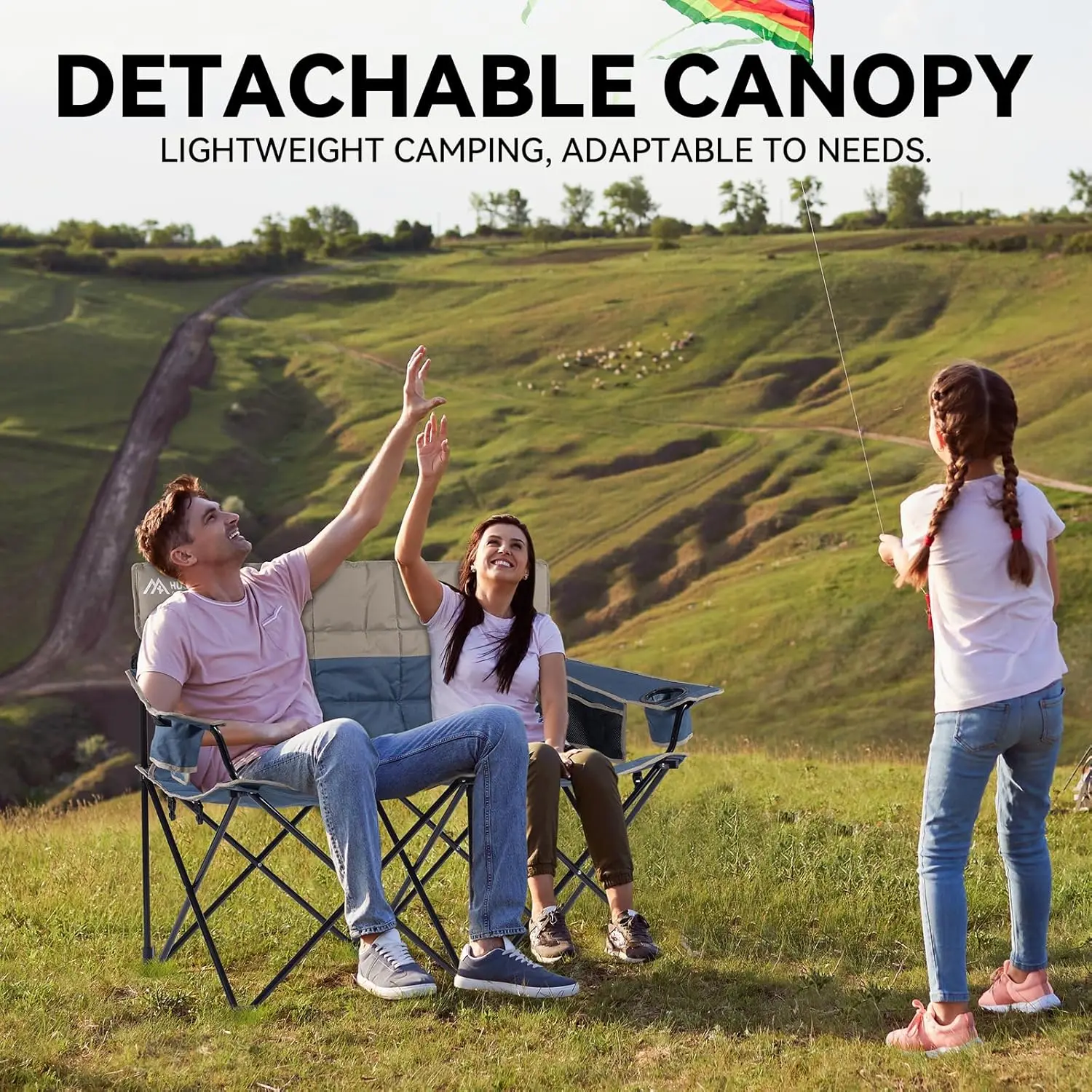 Double Camping Chair with Removable Canopy, Cup Holders & Cooler Bag for Beach, Fishing, Outdoor Use