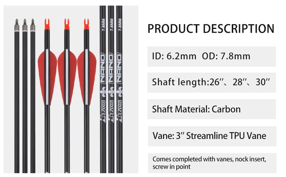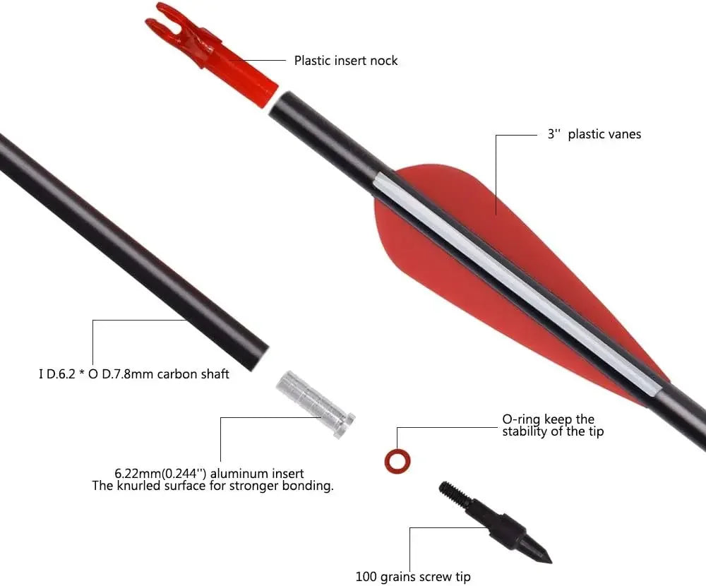 Elong 6/12PCS 26/28/30" Arrows for Compound Bows,Carbon Hunting Arrows for Archery Spine 500 with 100 Grain Screw Tips