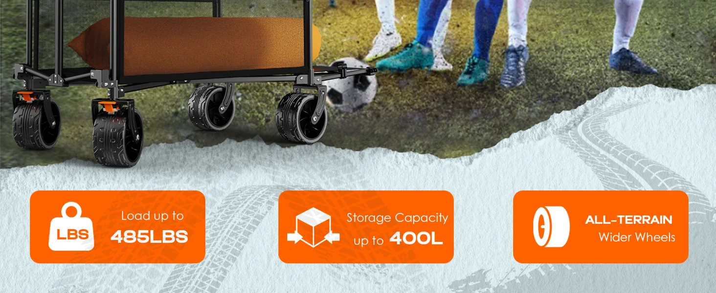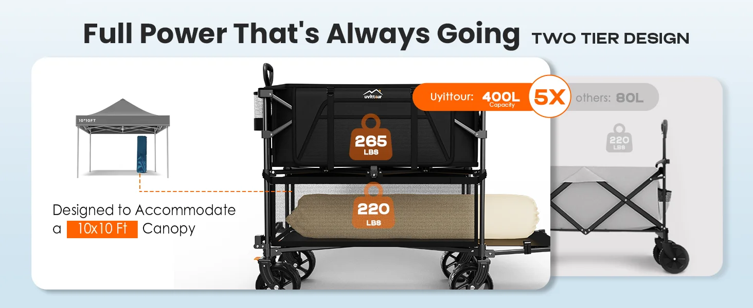 1. Enhanced Capacity of 400L: Accommodate all your essentials in a single trip, minimizing the need for multiple journeys! This exceptional collapsible wagon surpasses other wagons by 5X more efficient and stands out as the epitome of efficiency! But wait, there's more! With a double-decker design, it boasts the most stable structural frame and is crafted from 600D waterproof oxford fabric, enabling it to support up to 485 lbs with ease.