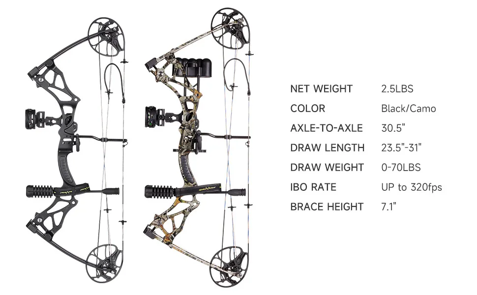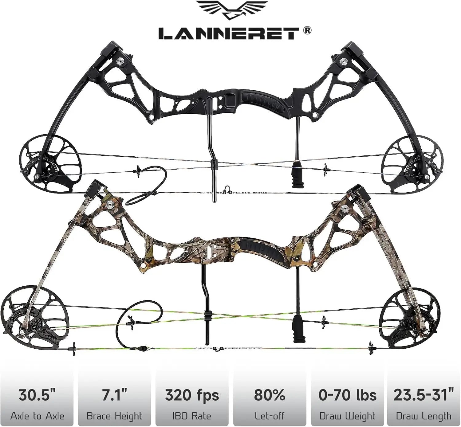 1. 【Suitable for Beginners】:Lanneret's bow IBO Speed: 320fps;,Axle-to-Axle: 30.5"; Draw weight: 0-70lbs, Draw length: 23.5" -31"adjustable without bow press,Brace height: 7.1\u201d, Hand Orientation: Right. Perfect for adults and beginners.