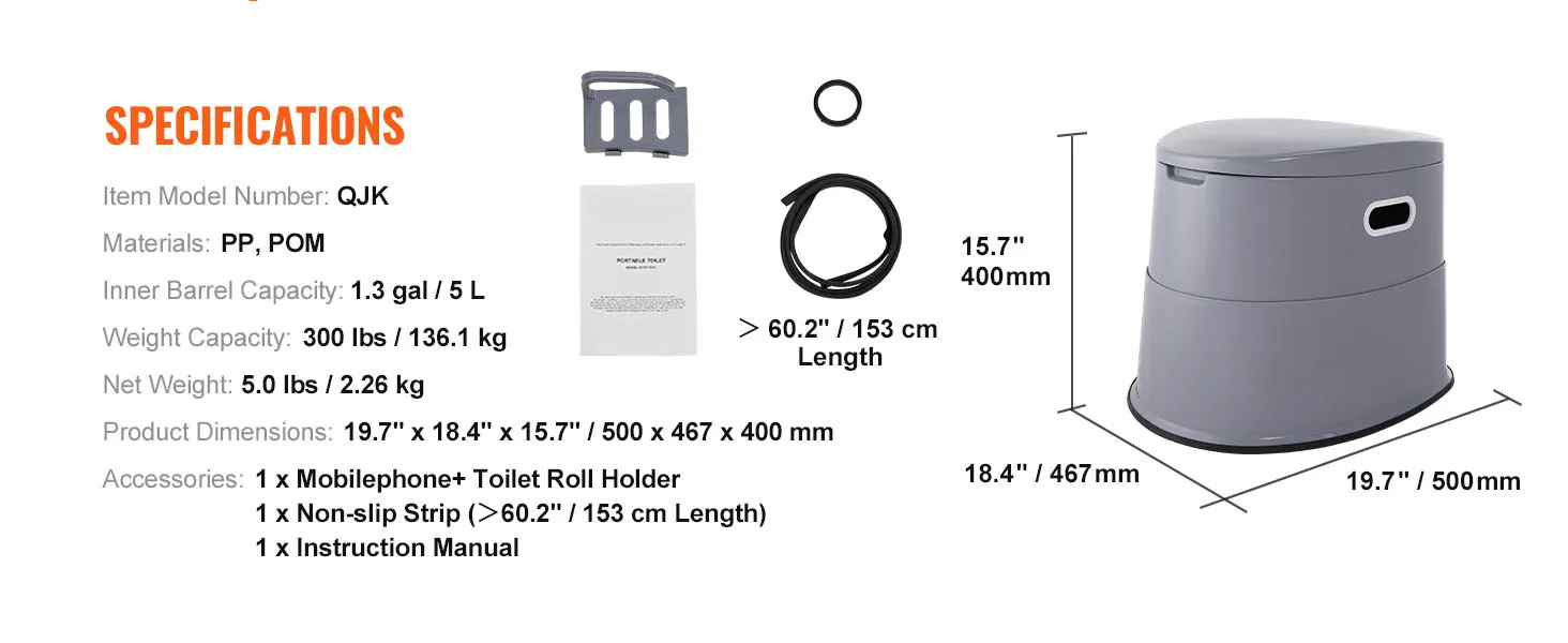 Non-slip Structure: This travel toilet features a wide and comfortable seat, measuring 19.7" x 18.4" x 15.7" (500 x 467 x 400 mm), providing greater comfort for adults. The portable potty's sturdy structure supports a weight capacity of up to 300 lbs (136.1 kg). The base is fitted with non-slip strips, ensuring good stability and preventing slipping.