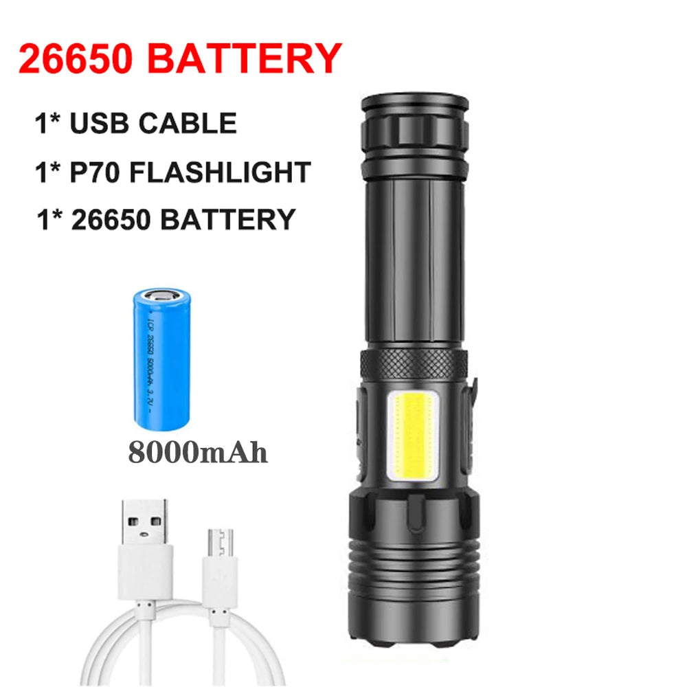 Rechargeable Super Bright Flashlight 7Modes High Lumens Tactical Flashlight Zoomable LED torch With COB Side Light and Display