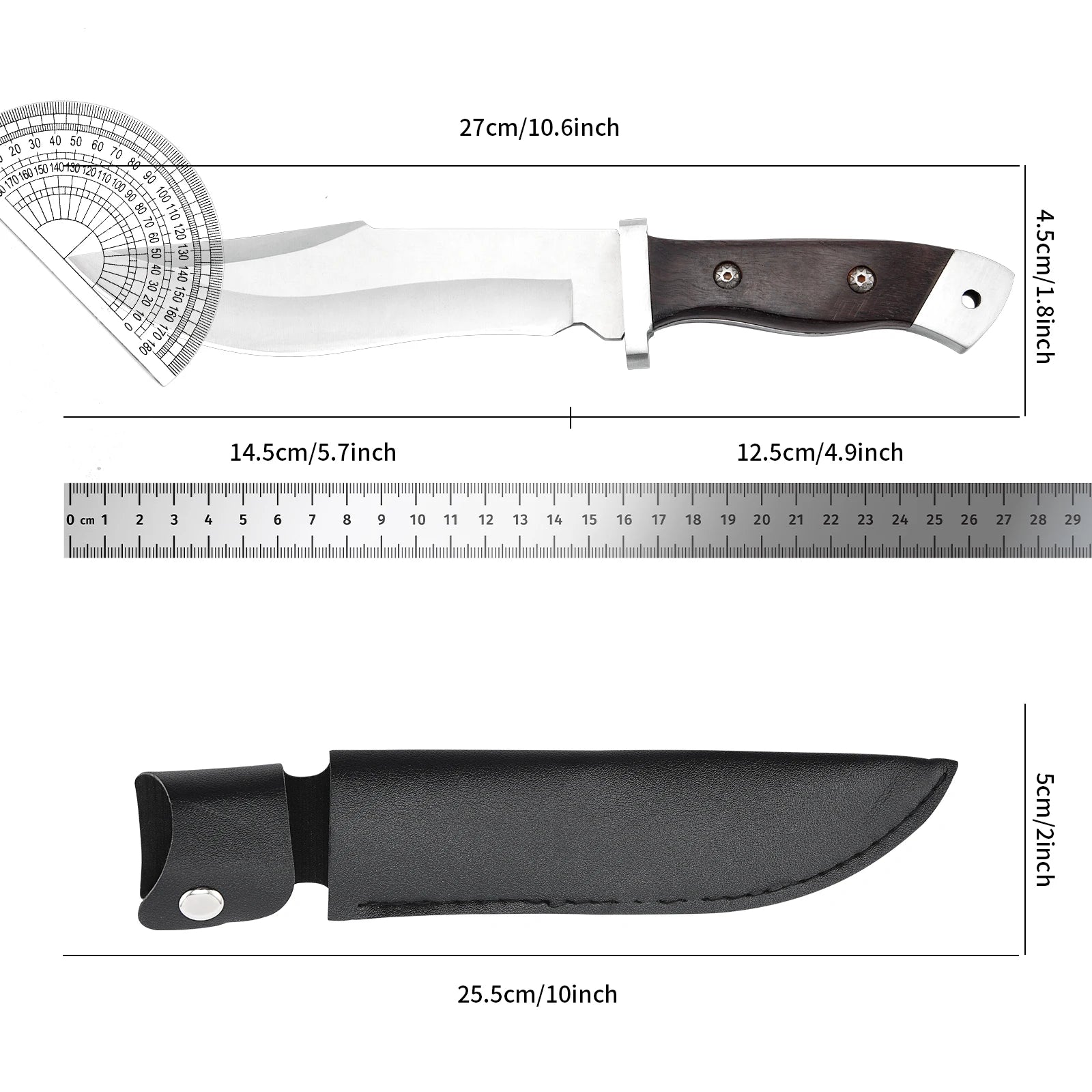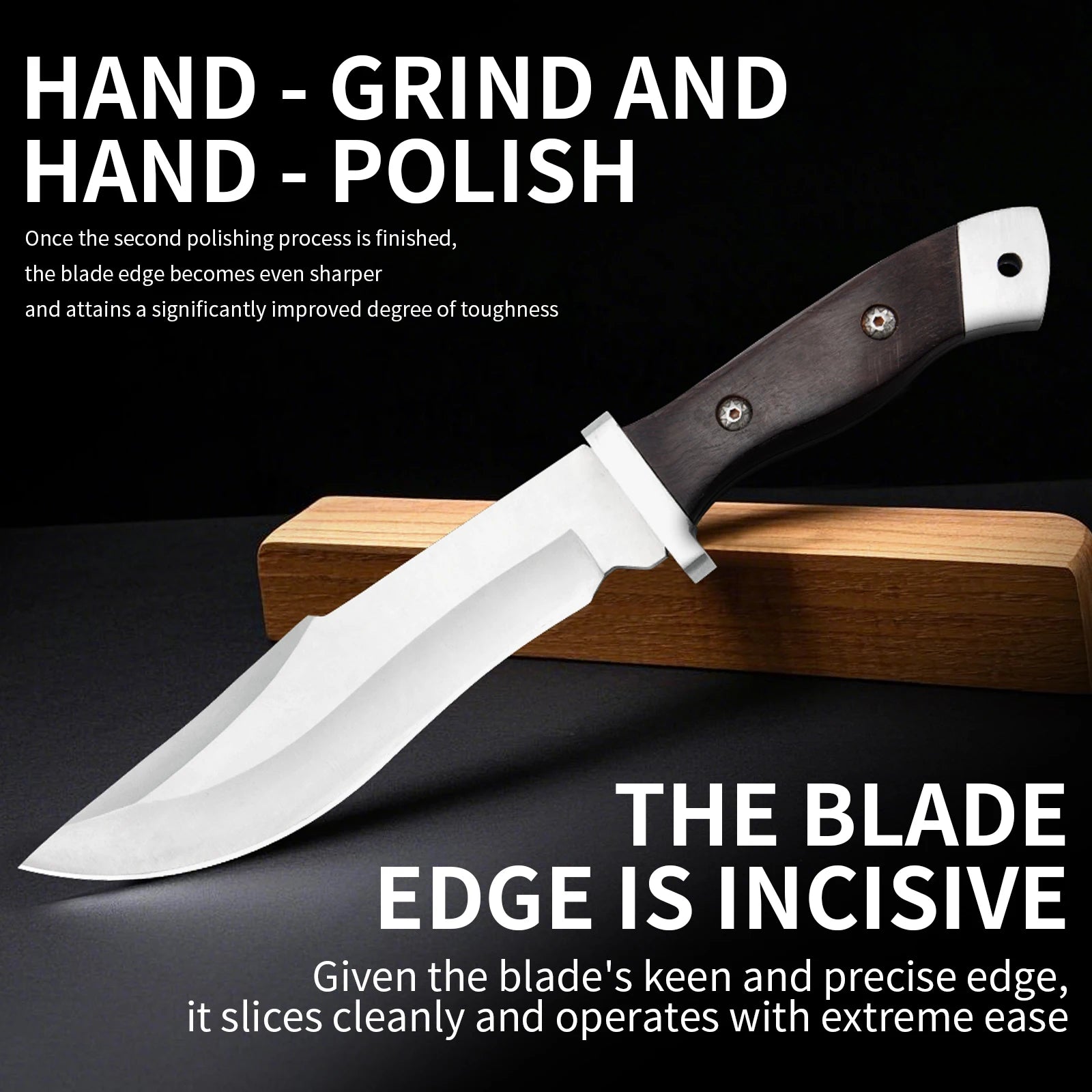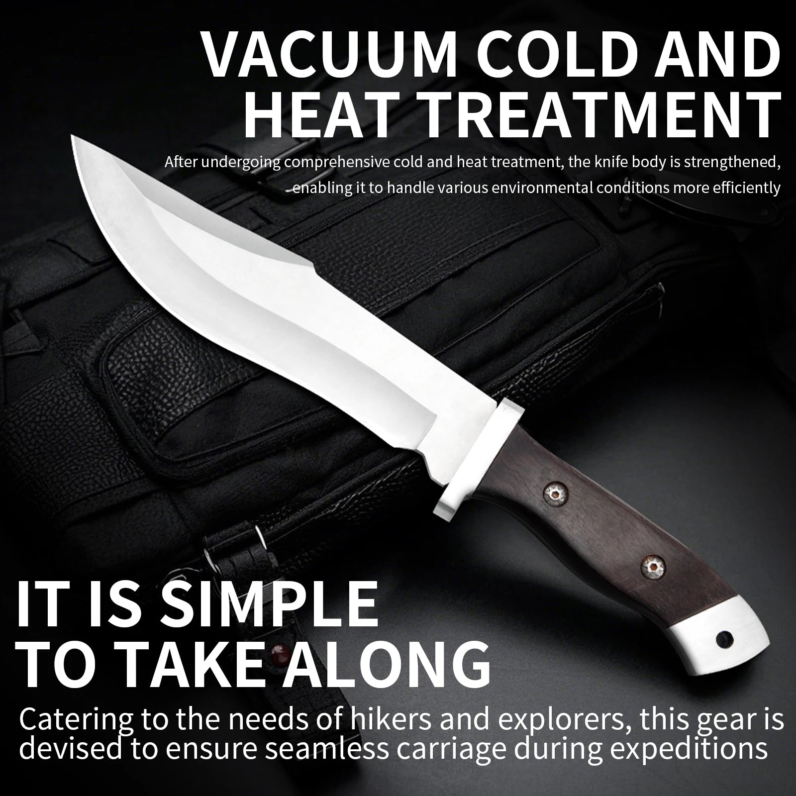 Stainless steel hunting knife with a wooden handle, paired with a black leather sheath, an essential tool for adventurers