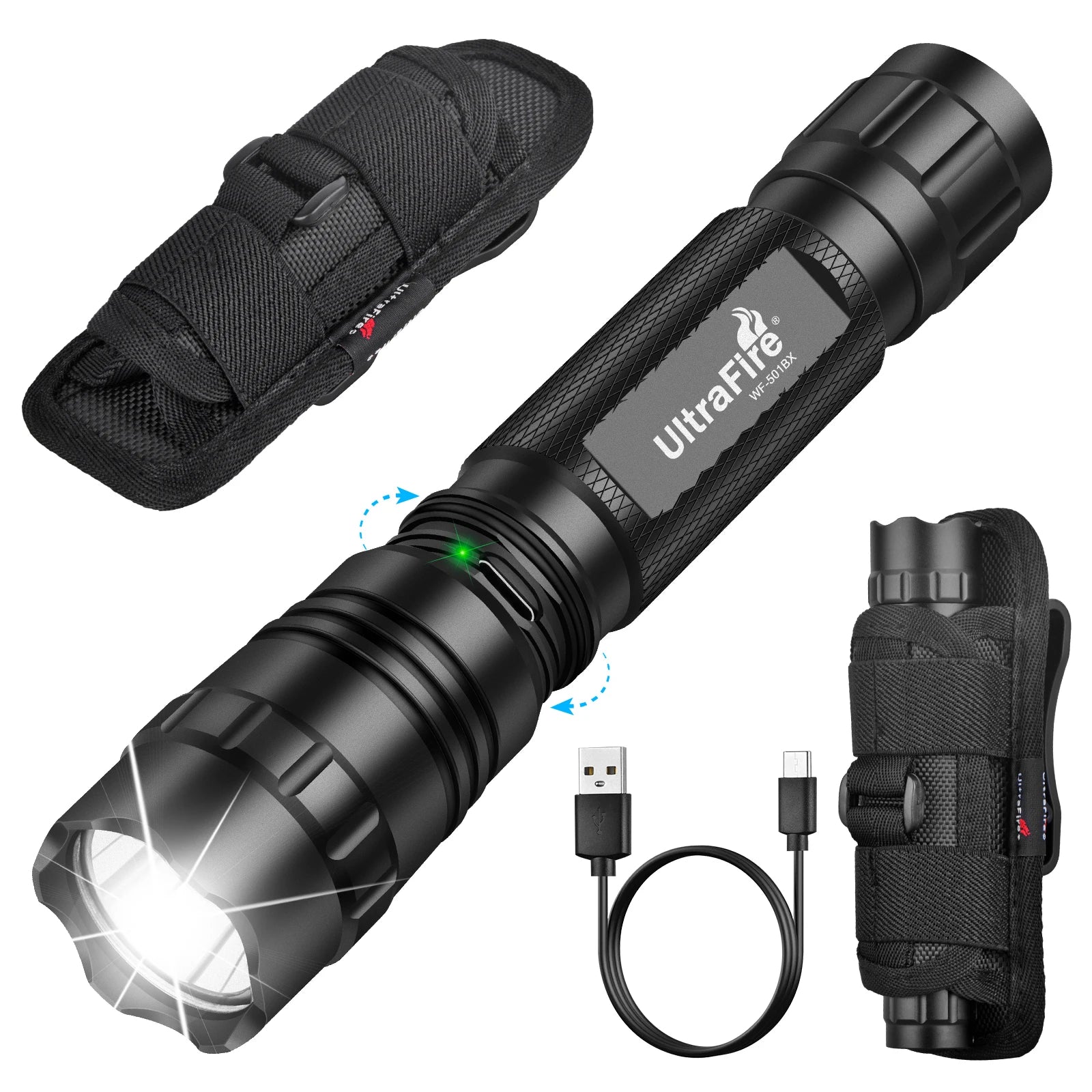 UltraFire WF-501BX Tactical Flashlight with Holster 3 Mode 1200 Lumens USB C Rechargeable Police Flashlight Law Enforcement Lamp